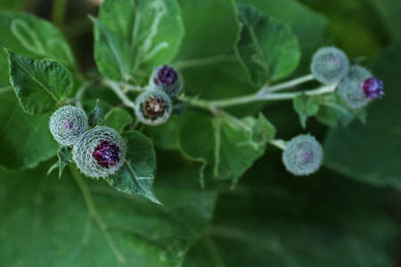 Lesser burdock buds close-up view with selective focus on foreground