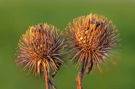 Arctium minus, lesser burdock dried flowers in the springtime. Close up.
