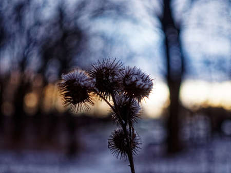 The Burdock root in winter, chilling air envelops, a few lingering leaves tremble, still atmosphere