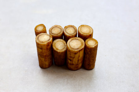 Heap of dried licorice roots on a white background.