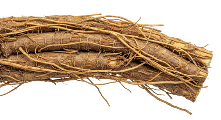 Close-up of fresh ashwagandha (rasayana) roots, isolated on a clean white background, showing texture and natural detail.