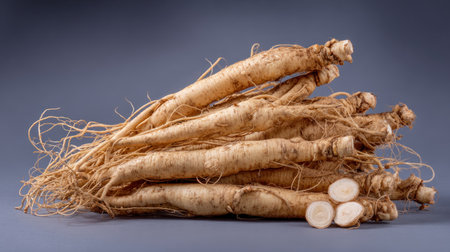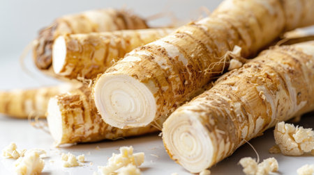 Fresh horseradish roots arranged on a white background, showcasing their earthy texture and culinary potential, perfect for recipes and organic cooking.