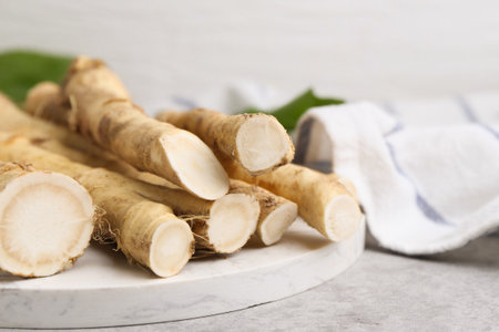 Fresh raw horseradish roots on light gray table, closeup