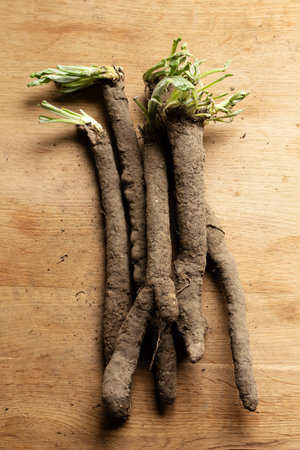 Fresh dandelion roots on a wooden cutting board
