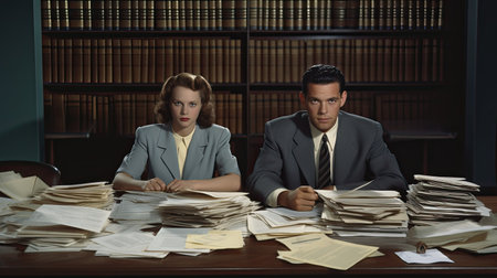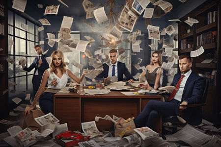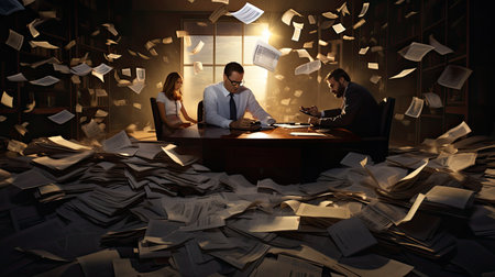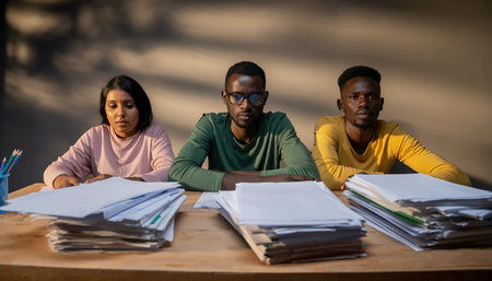 Three diverse individuals are seated at a wooden desk, surrounded by stacks of paperwork, possibly working on a project or reviewing documents.