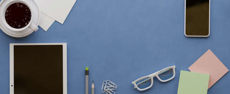 Overhead shot of office desktop. Telephone, tea cup, glasses, pencils, notebook, pen, potted plant on light background.Top view with copy space, flat lay. 3d illustration. Render.