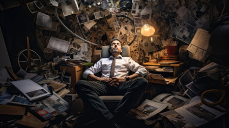 A top view of an overworked young Scandinavian businessman lying on the floor that is full of papers and documents in an office scene. Generative AI image AIG30.
