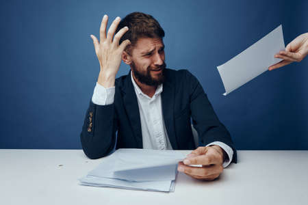 Businessman is not happy, businessman is working in the office, businessman is on a blue background.