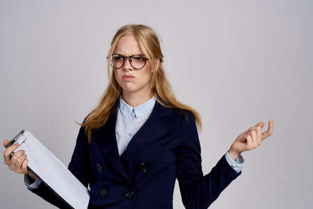 dissatisfied blonde in glasses and uniform with a folder in her hand.