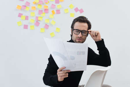 man adjusting eyeglasses while looking at documents near gray wall with sticky notes