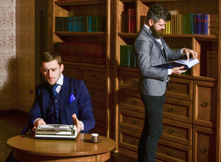 business development and partnership. stylish corporate men in formal clothing discussing contract agreement terms holding documents and papers