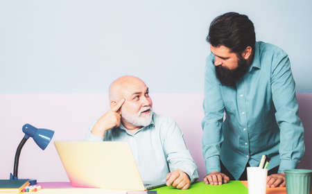 Male Multi Generation Family using Internet. Male workers chatting at office desk meeting. Businessman wearing shirt working with laptop at table.