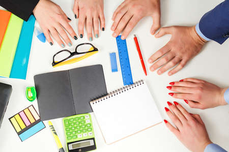 Business people planning for a new project. Business woman and businessman office meeting. Team work concept. Closeup young coworkers crew working with new startup during meeting.