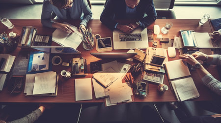 Top view of business diverse people and meeting team at desk, Aerial view of header or banner businessman and businesswoman sitting around a conference table
