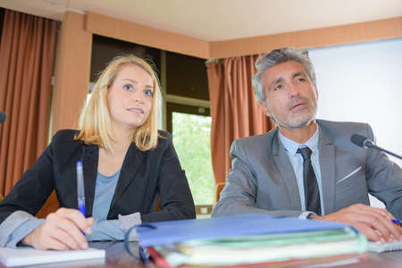 Businessman and businesswoman team at office meeting. Business people men and women group conference in office