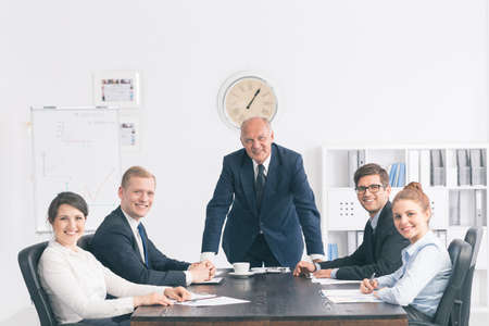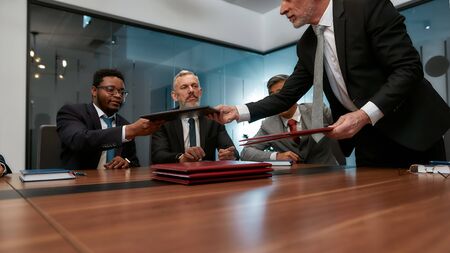 Discussing new poject. Mature businessman in formal wear giving folders to his multicultural colleagues while having a meeting in the office