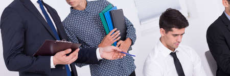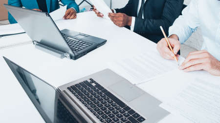 Corporate meeting. Business partnership cooperation. Men working with papers documents.