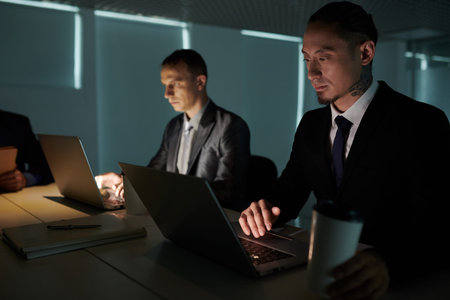Portrait of two successful mature business people using laptop while sitting at desk in minimal office interior and wearing black suits, copy space