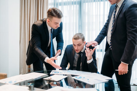 business team argument debate. statistics papers lively discussion. executives or managers review report documents with graphs and diagrams