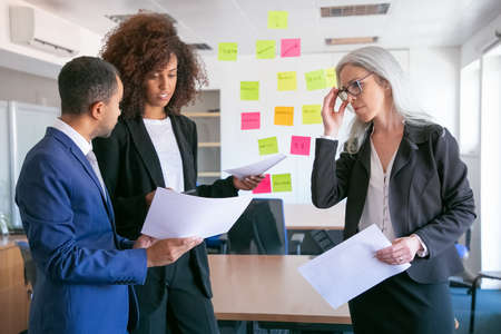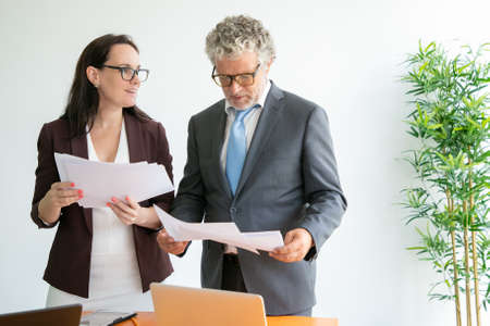 Professional partners discussing project and holding papers in conference room. Successful concentrated grey-haired entrepreneur talking, standing and reading. Business and management concept