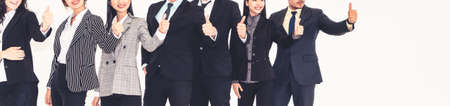group of smart young asian businessmale and female formal dress teamwork laugh smile standing hand point portrait confident and leadership determination modern office design background
