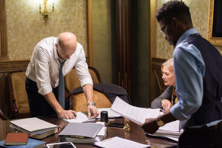 Three intercultural lawyers working with papers at meeting while two men standing by table and looking through documents