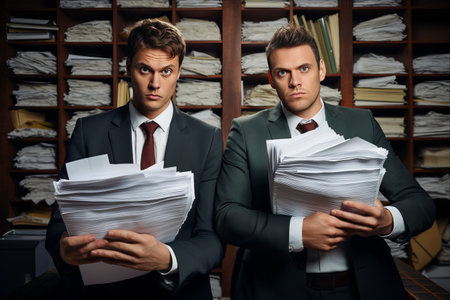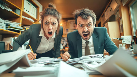 A tense interaction unfolds in an office as an angry boss yells at his female employee, both engulfed in piles of paperwork and documents.