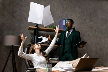 Mad business people office. Team people are unhappy with their leader. Intern woman manager does not cope with his duties. Crazy crowd in stress throw up their chiefs papers. Documents for signature.