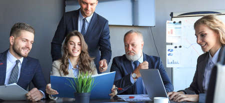 Confident businesspeople discussing analytics data. Successful experienced managers in office suits meeting in conference room and planning strategy. Teamwork, business and management concept