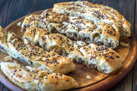 Turkish style meat and cheese stuffed filo dough borek served su boregi