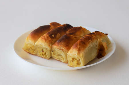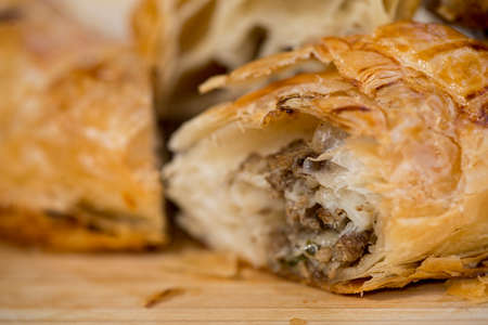 pie with ground beef filling, rolls of puff pastry with meat on plate