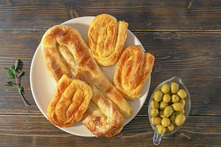 Balkan cuisine. Bureks ( filled pastry, popular national dish ) and olives on dark rustic table, copy space