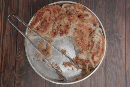 A Guo Kui, Crispy stuffed flatbread is truly scrumptious with flaky and crispy layers on the outside and a flavorful filling on the inside food, happy vendor arranging. Chengdu street food, China.
