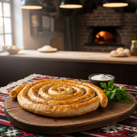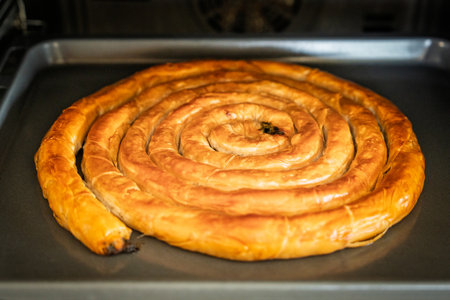Golden Spiral Pastry Delight Freshly Baked Burek on a Baking Sheet in the Oven