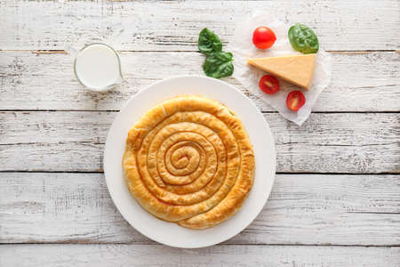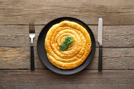 Homemade greek spanakopita pie with organic cheese on wooden board. wooden background. top view.