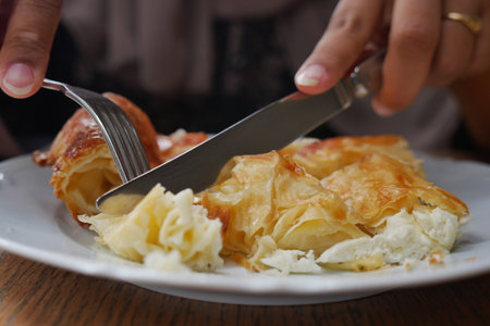 cutting Traditional Turkish Cuisine Pastries borek with knife and fork