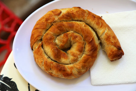 Albanian cuisine. Typical breakfast or street food - byrek pastry. Stuffed pastry made of flaky filo dough.