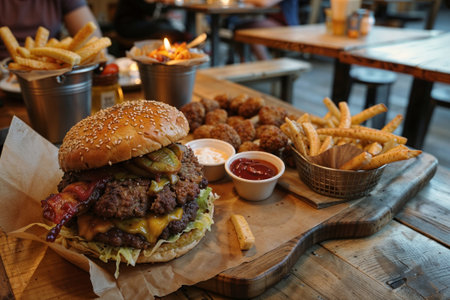 Delicious burger stacked high with toppings beside crispy fries and meatballs at a rustic restaurant