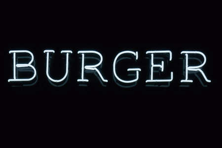 Burger. Neon inscription, blue and black colors. Isolated glowing title for decoration.