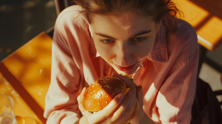Overhead shot – a young blonde girl in a pink shirt sitting at a table eating a hamburger. Soft light from the window.