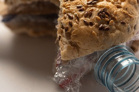 Fresh tasty cut out burger with plastic waste and paper cardboard inside on white background. Recycled waste in our food concept