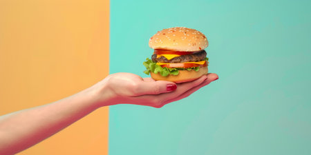 Delicious burgers and crispy fries on colorful background for fast food advertising