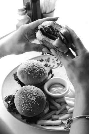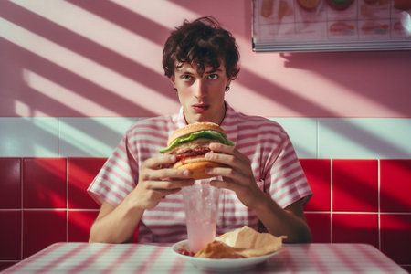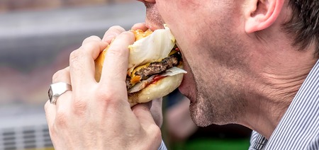 Burger man fast tasty meal caucasian hungry hamburger unhealthy food adult lunch eat sandwich