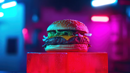 Juicy, gourmet cheeseburger sitting atop a bold red cube, with vibrant lighting enhancing its textures and rich colors.