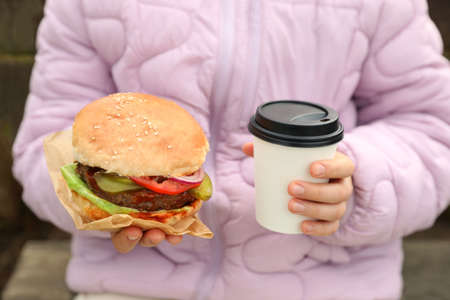 Little girl holding fresh delicious burger and cup of coffee outdoors, closeup. street food