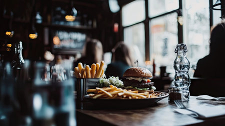 Mouthwatering Gourmet Burger with Crispy Fries Served in a Cozy Restaurant Setting for Food Lovers