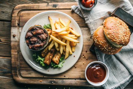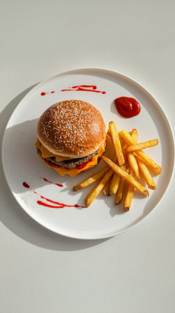 American cuisine juicy cheeseburger with fries on white plate featuring ketchup and golden bun. concept of classic fast food, savory meal, delicious comfort food.
