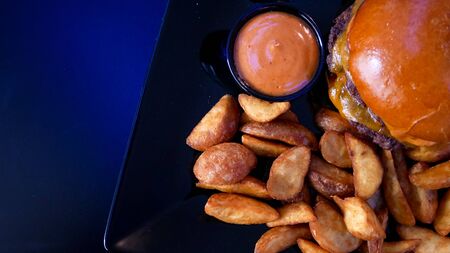 French fries, burger, pork ribs on a stylish board on a wooden background. Fried potatoes. The concept of fast food, junk food and fast food preparation.