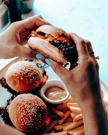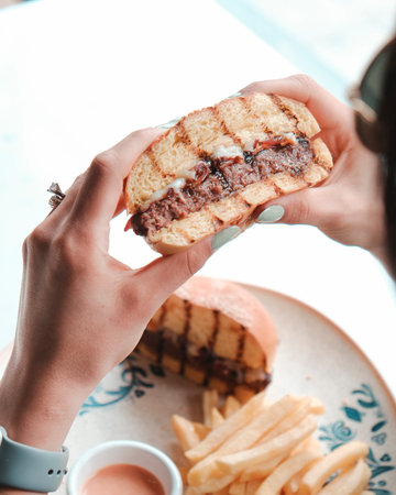 fast food, people and unhealthy eating concept - close up of woman hands holding hamburger or cheeseburger