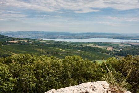 Landscape view of Palava in South Moravia. Lake Nove Mlyny and towns Pavlov and Klentnice under blue sky with clouds